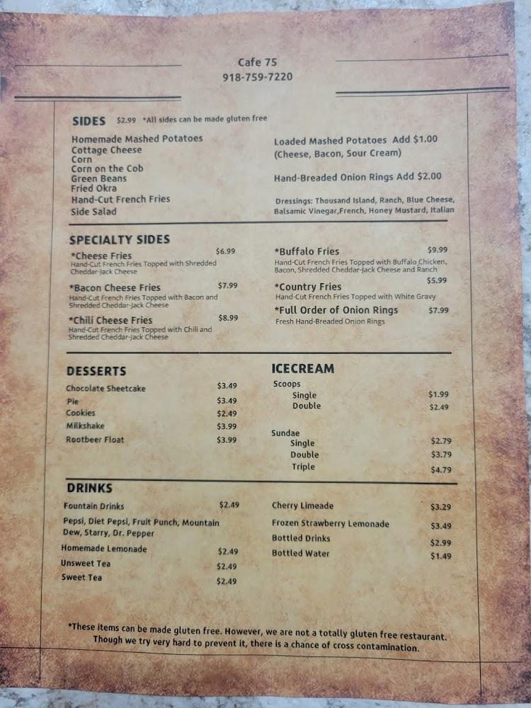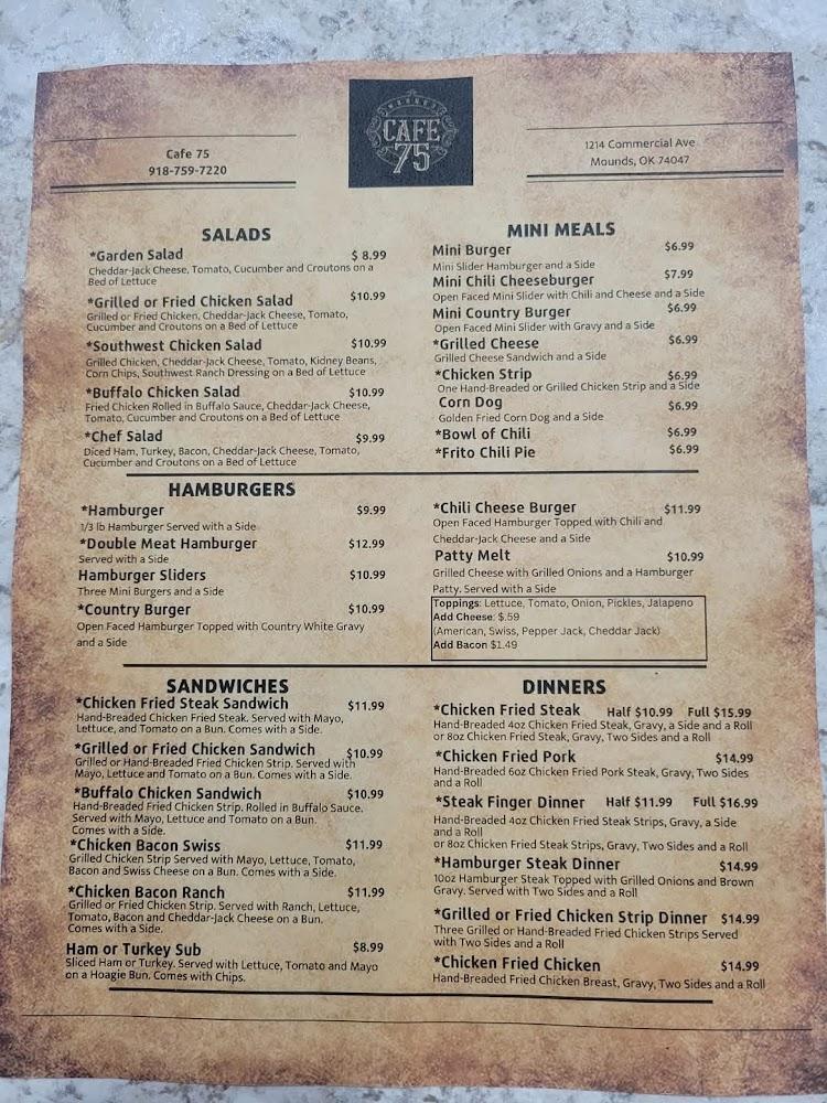 Welcome to Cafe 75, your charming destination for American comfort food in the heart of Mounds, OK. Indulge in our made-from-scratch burgers and crispy fries, or savor our world-famous hand-breaded chicken fried steak, prepared with love reminiscent of home-cooked meals. Our quaint cafe boasts a cozy atmosphere perfect for solo diners or gathering with friends. Enjoy a diverse selection of teas and delectable desserts, all served with swift, friendly service. With options for dining in, takeout, and delivery, Cafe 75 is designed to cater to your cravings. Visit us at 1214 Commercial Ave and experience comfort food done right!