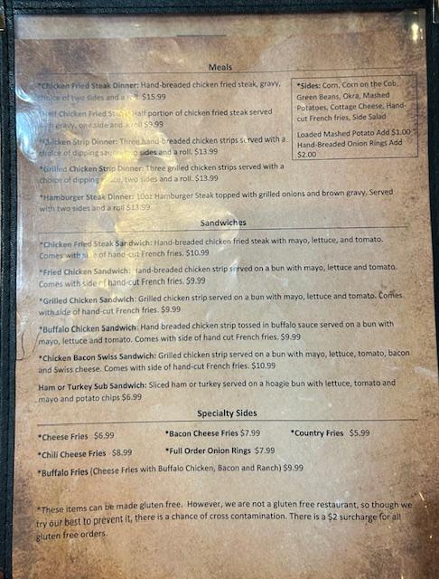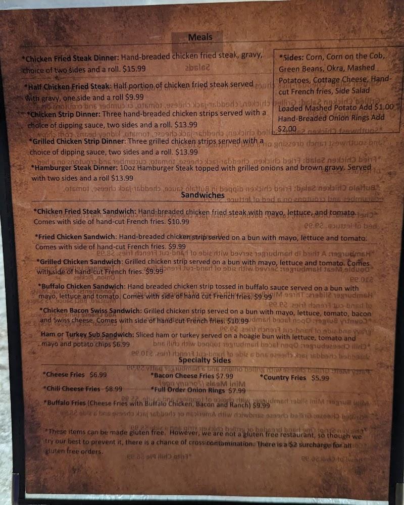 Standouts include the chicken fried steak dinner and bacon cheeseburger, both satisfying and flavorful. Small meals are also available for those wanting lighter fare.